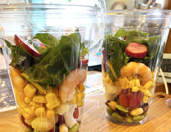 季節の新鮮なお野菜とフルーツ・もち麦やキヌア・ナッツ・モチコチキンを合わせた満足感のあるサラダプレート。※店内でのご提供のみ。