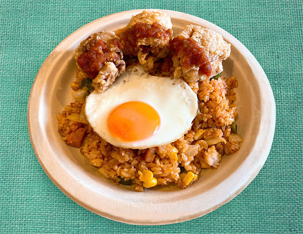 ピリ辛なハワイの炒めご飯。スパムや淡路島玉ねぎがご飯との相性◎モチコチキンと目玉焼き、サルサソースを添えて。