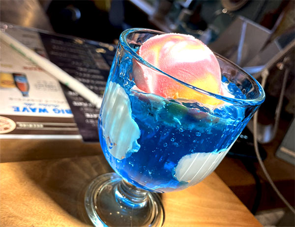 レインボーアイスクリーム(カシス/オレンジ/ヨーグルト)が青空のパインゼリーの上に!ハイビスカス&パインのミニジュース付き。
