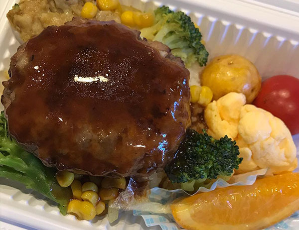 ミニハンバーグ(グレイビーソース)/コーンやブロッコリーなどのお野菜/ご飯/デザートをボックスにつめました!内容は都度変わる可能性がございます。