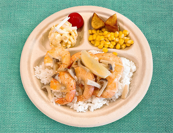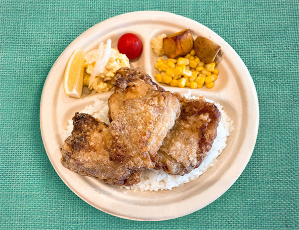 マカロニたまごサラダ・トマト・コーン・ポテトが付いています。(※一部メニューを除く)